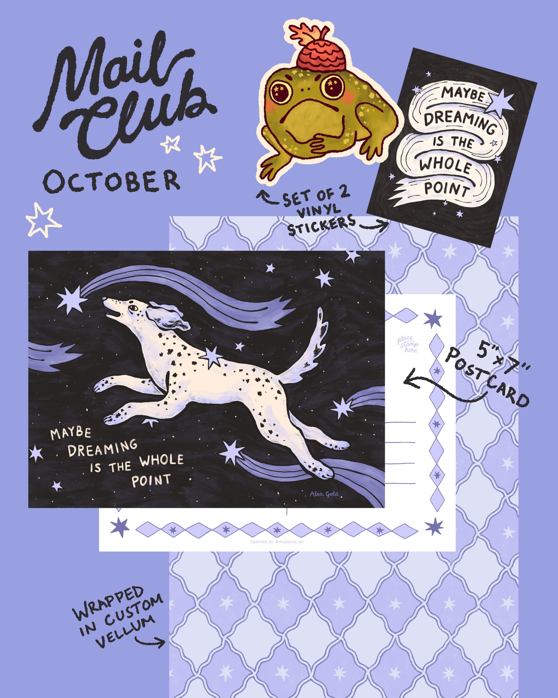 You'll receive a letter with October's 5"x7" art print postcard and stickers, wrapped in vellum and packed with care in a custom printed envelope. The envelope art/color will be chosen at random from all the monthly envelopes I've created (it'll be a surprise!).